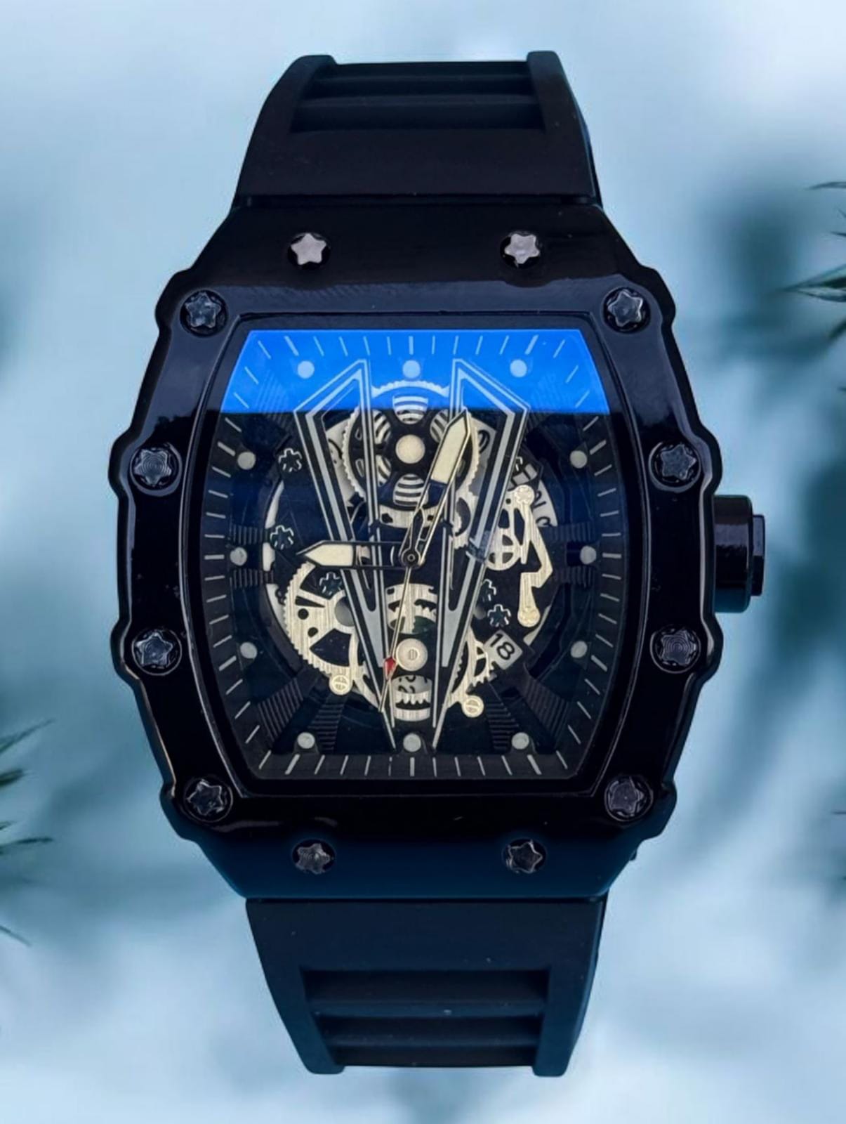 Striking Design: The bold black case and skeletonized dial showcase the intricate inner workings of the watch, creating a visually stunning and modern aesthetic.